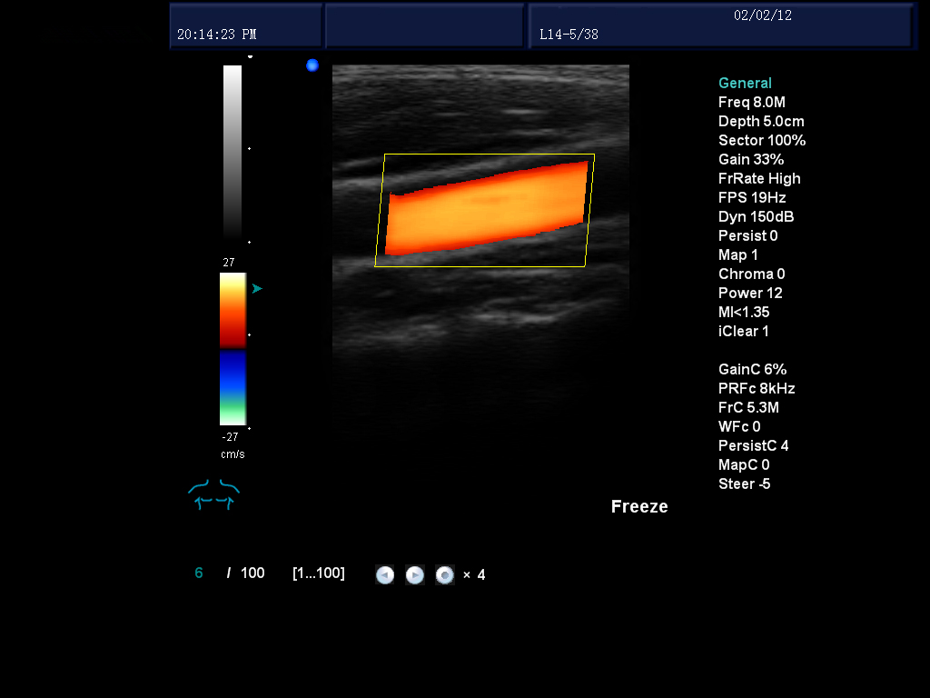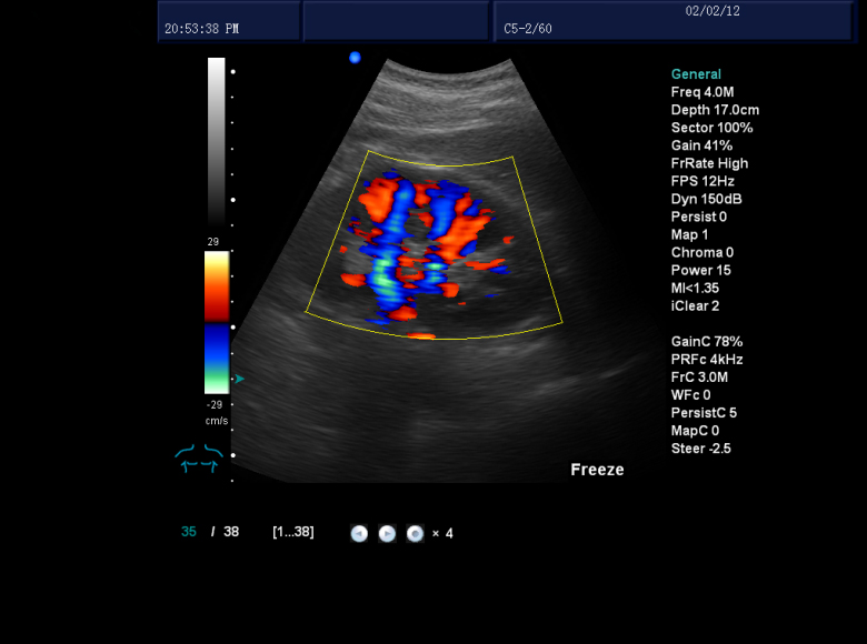 彩色血流圖像調(diào)節(jié)參數(shù):多普勒頻率、取樣框位置和大小、基線、彩色增益、偏轉(zhuǎn)角度、壁濾波、累積次數(shù)等。