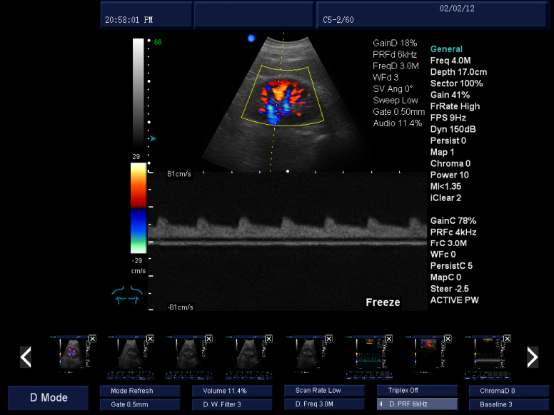 三同步顯示:二維、彩色和頻普三種模式同時(shí)處于實(shí)時(shí)狀態(tài),方便醫(yī)生對(duì)比觀察和定位取樣。 諧波成像:組織諧波成像使圖像更光滑、柔和、清晰,提升臨床診斷組織鑒別。